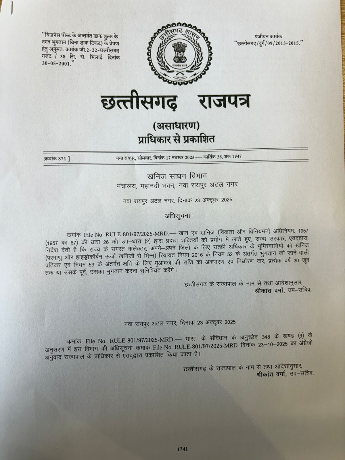 RULE-801/97/2025-MRD दिनांक 23.10.2025 के अंतर्गत जारी इस अधिसूचना द्वारा जिला कलेक्टरों को वार्षिक सतही मुआवजा निर्धारित करने तथा खनन पट्टा धारकों को उनके आवंटित भूमि क्षेत्रों में प्रवेश दिलाने का विधिक अधिकार प्रदान किया गया है—एक ऐसा कार्य जो निजी भूमि सौदों में देरी के कारण पहले वर्षों तक अटका रहता था।